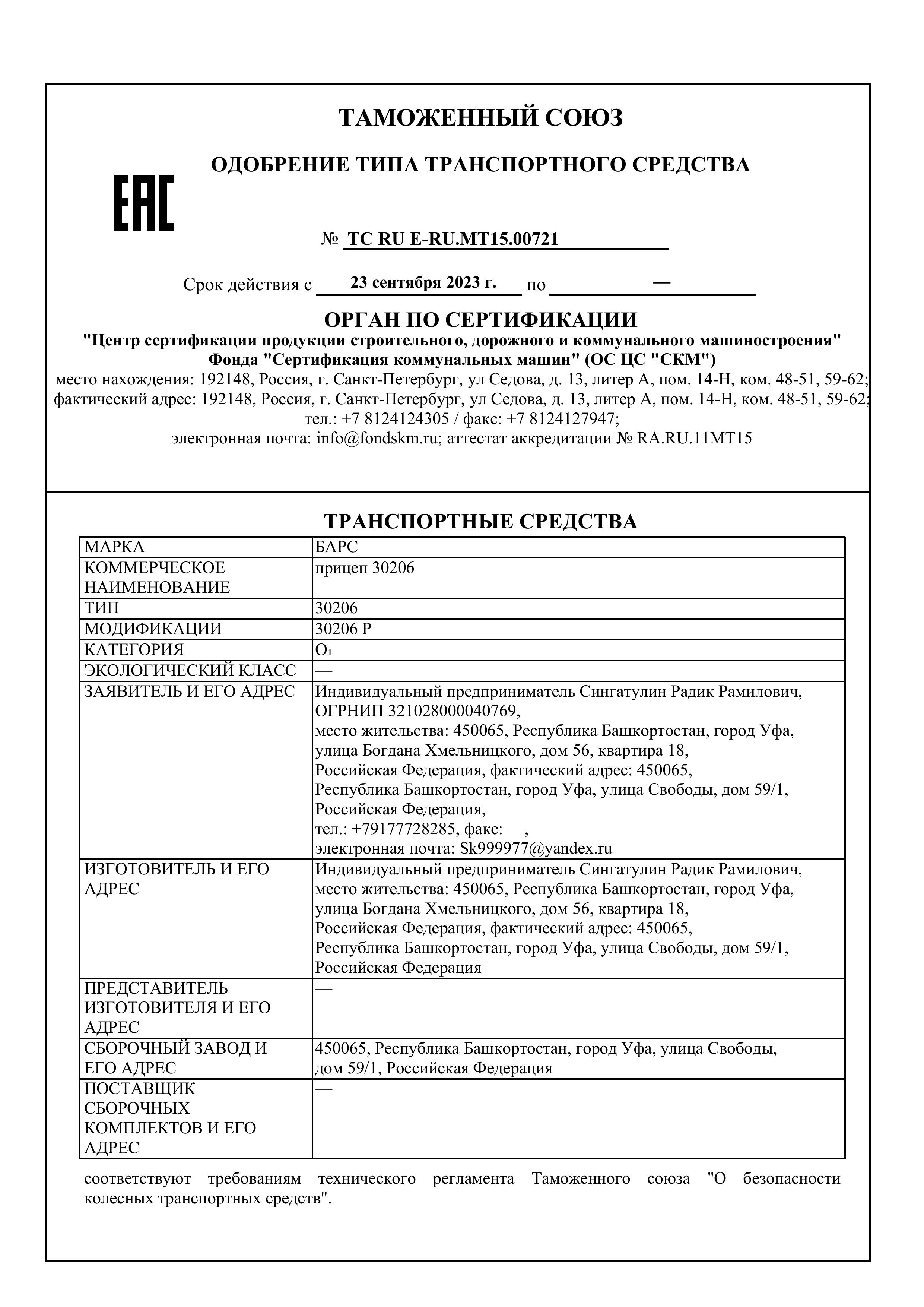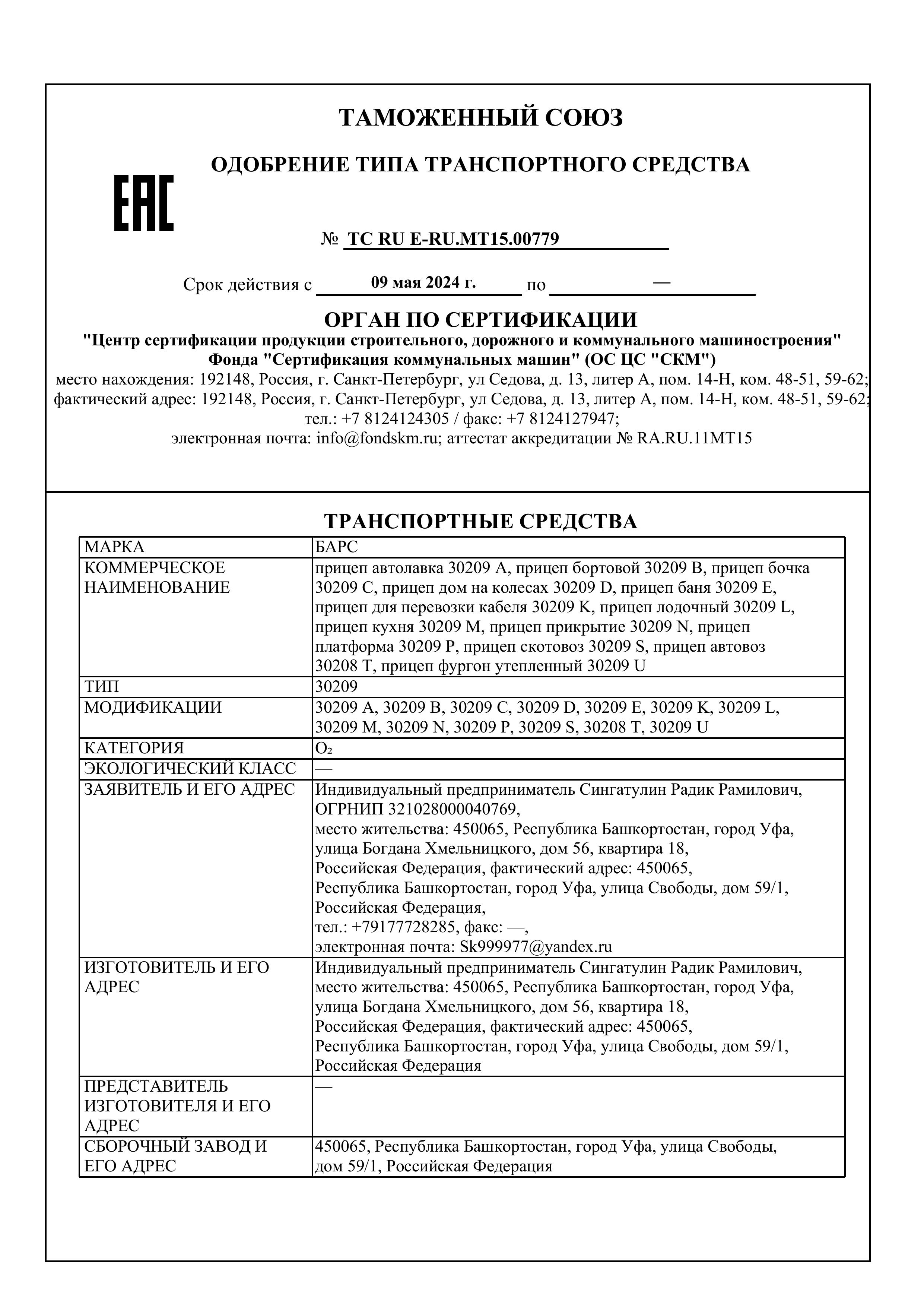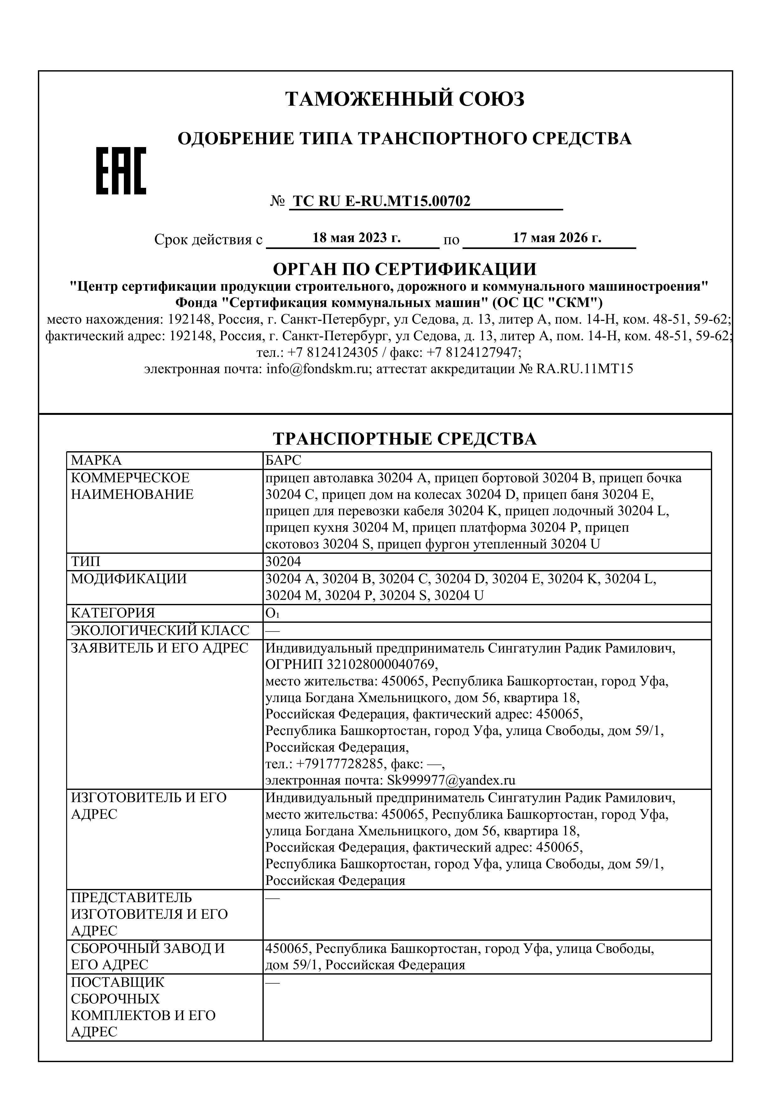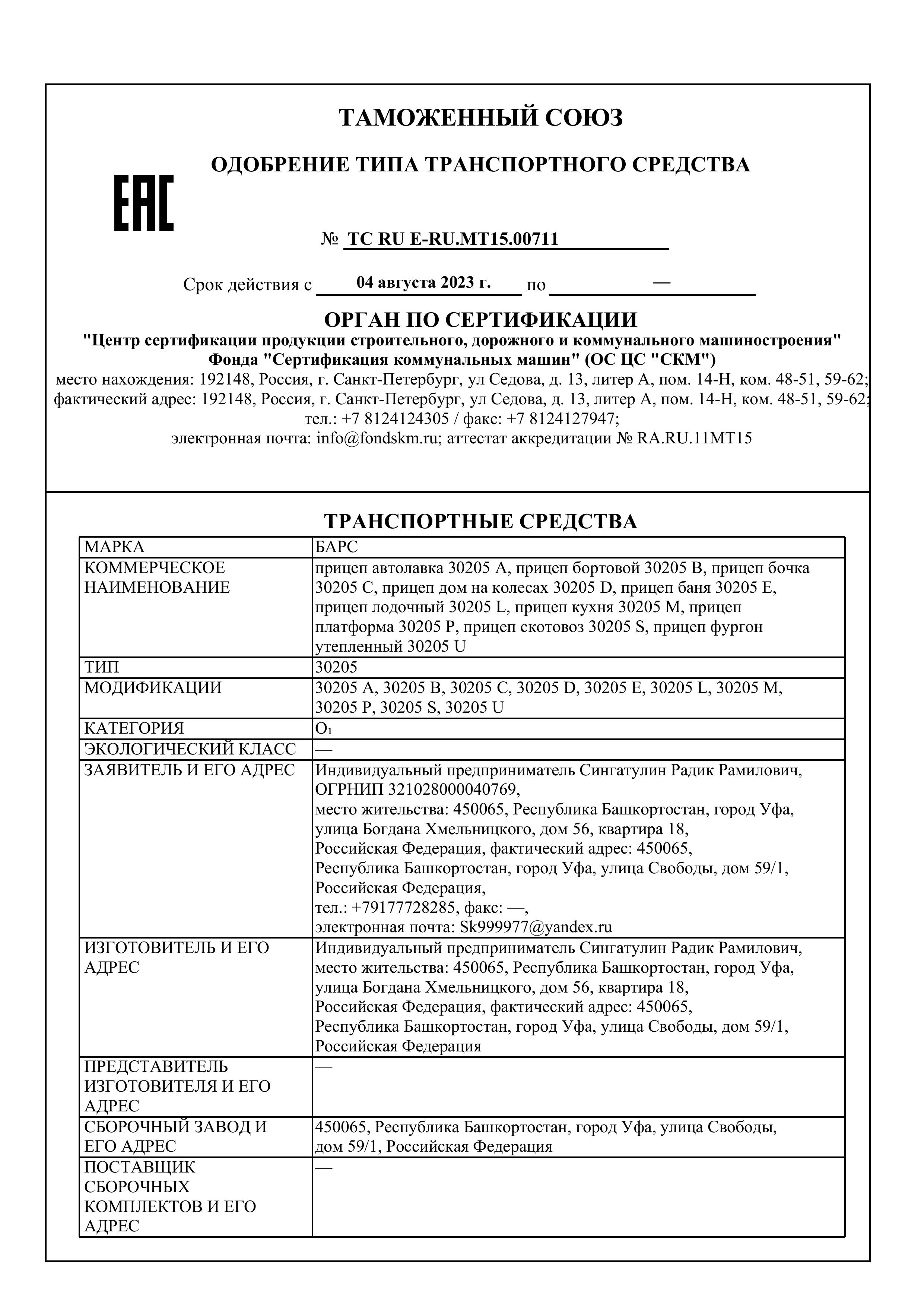 Все прицепы компании изготавливаются с расширенным одобрением типа транспортного средства (ОТТС). На сегодняшний день у «Барс» более 11 таких одобрений, что гарантирует отсутствие проблем с постановкой прицепа на учет и его технической эксплуатацией.