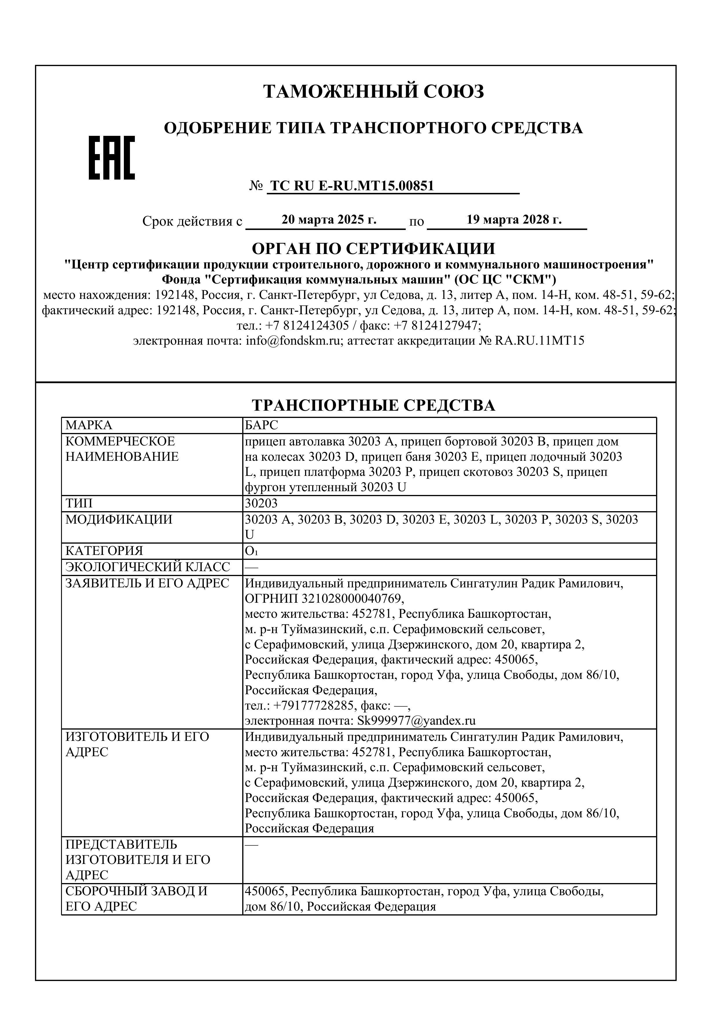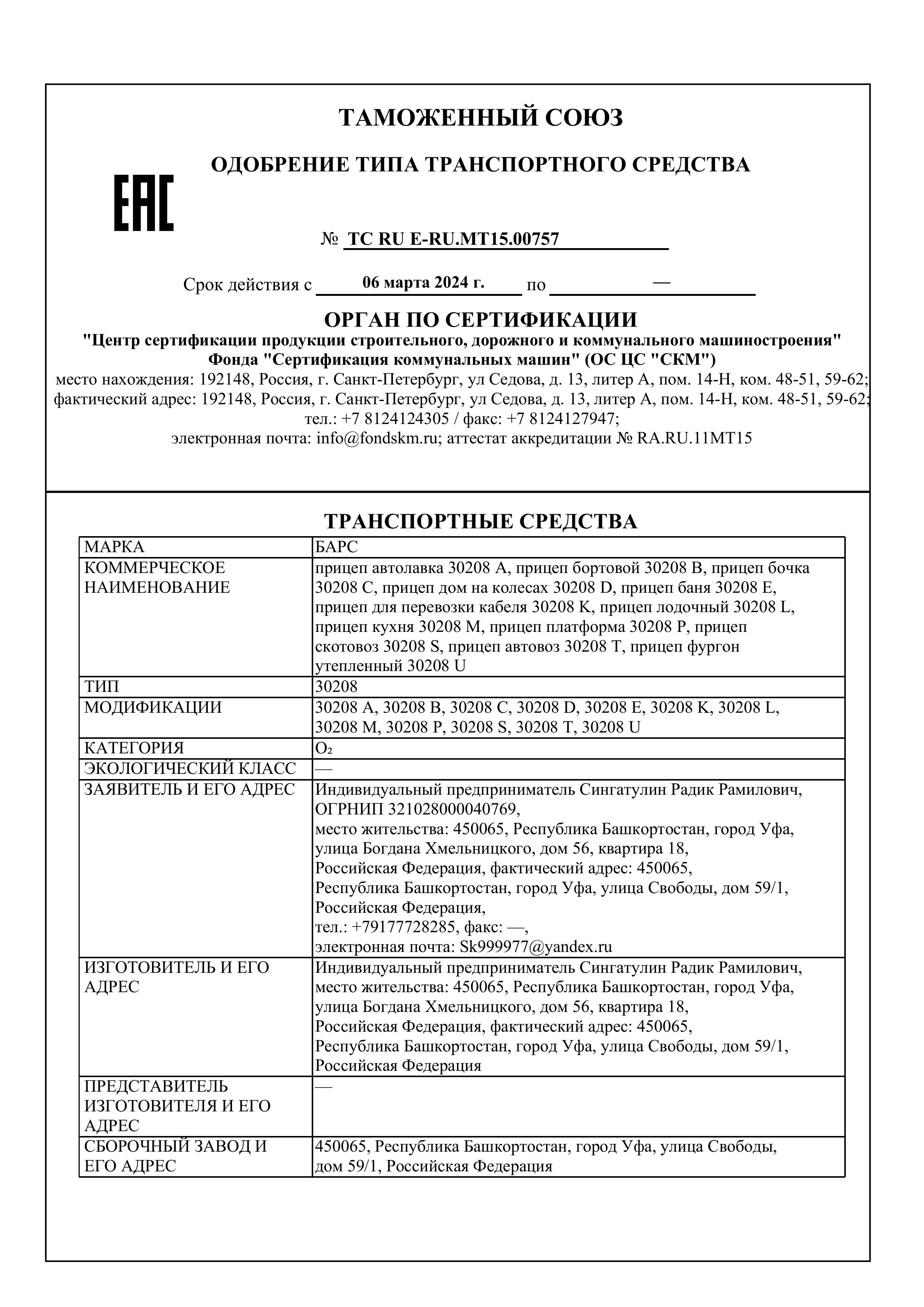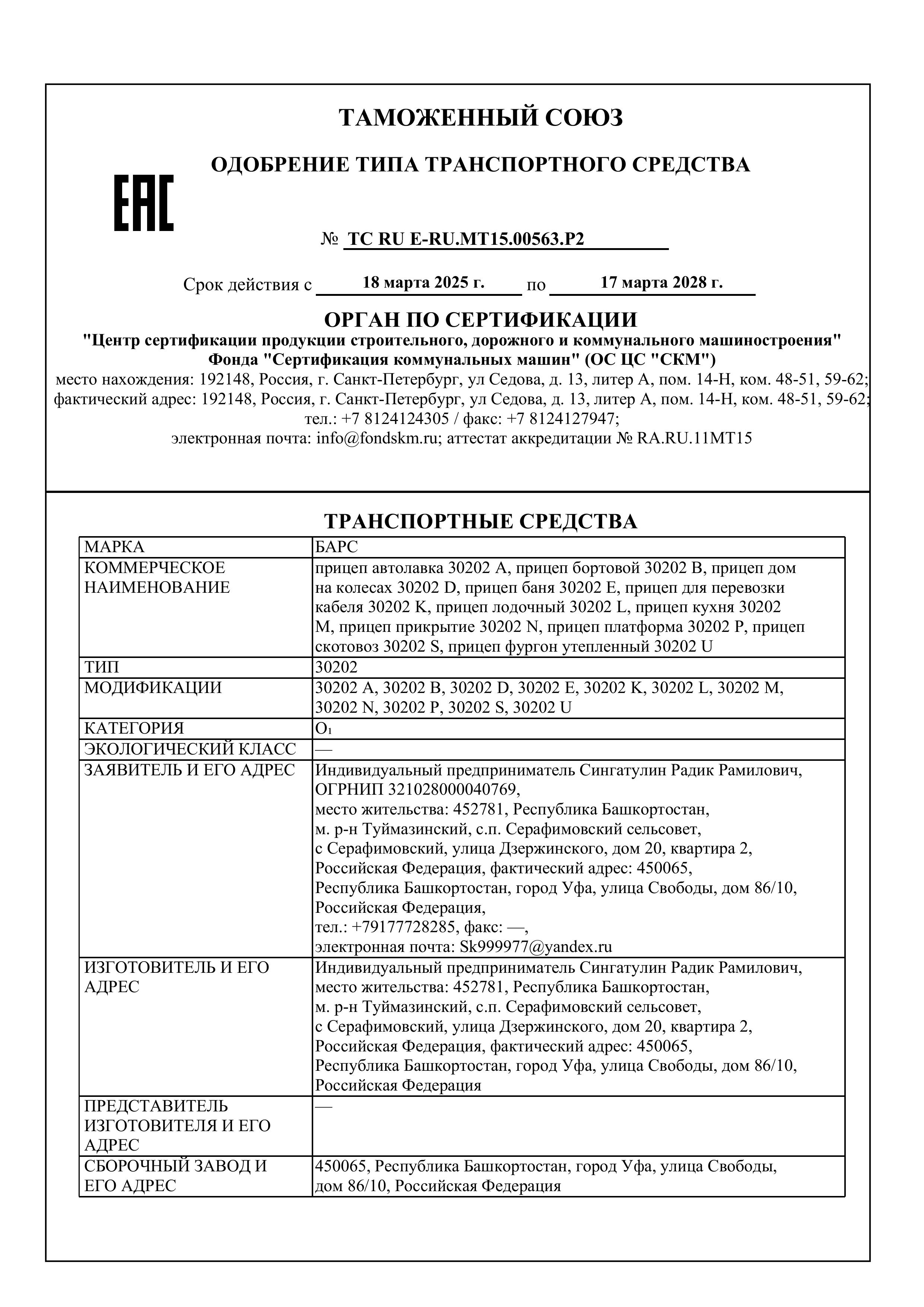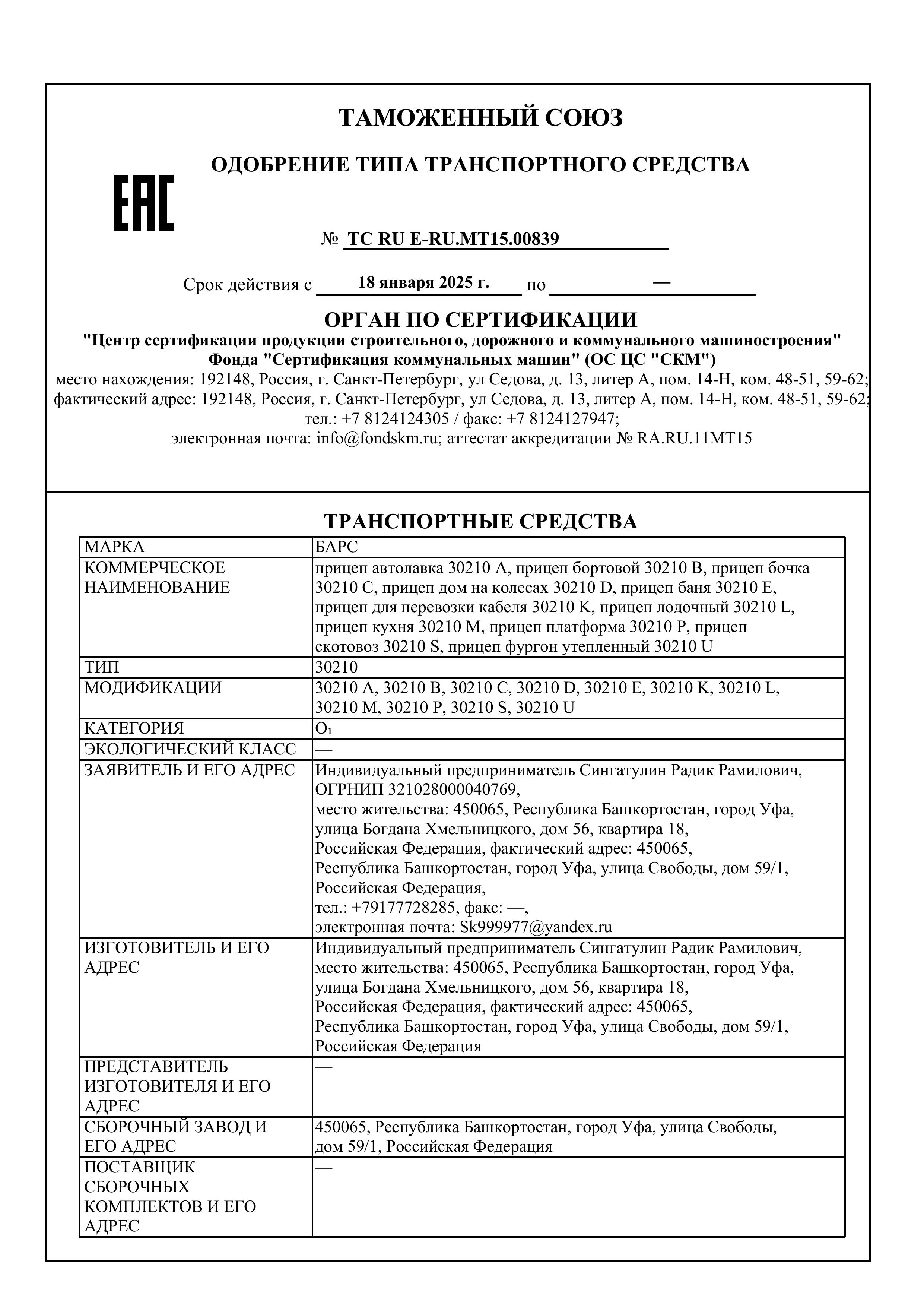 Все прицепы компании изготавливаются с расширенным одобрением типа транспортного средства (ОТТС). На сегодняшний день у «Барс» более 11 таких одобрений, что гарантирует отсутствие проблем с постановкой прицепа на учет и его технической эксплуатацией.